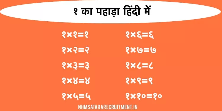 १ का पहाड़ा हिंदी में | 1 Ka Pahada In Hindi | Multiplication Table of 1 | पहाड़ा एक गणितीय सूची है जिसे प्रायः छोटी कक्षाओं के बच्चों को अच्छी तरह से याद करा दिया जाता है। जैसे की आप सब जानते हैं कि गणित की केलकयुलेशन में पहाड़ों का कितना महत्व है। गुना एवं भाग की अंकगणित क्रियाओं का करने के बाद इसका निर्माण व उपयोग किया जाता है। वैसे यदि किसी को भी १ से ९ तक भी पहाडे याद हो तो पर्याप्त है लेकिन गणितीय तथ्थो को तेज़ी से हल करने के लिए आप सभी ज़्यादा से ज़्यादा पहाडे याद करे।