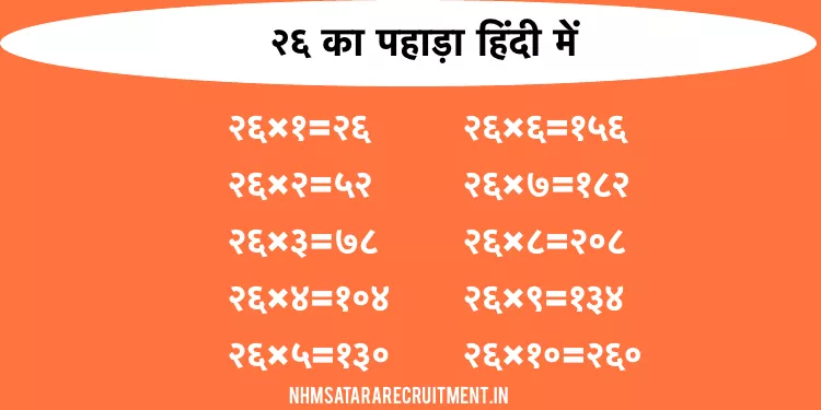 २६ का पहाड़ा हिंदी में | 26 Ka Pahada In Hindi | Multiplication Table of 26 | पहाड़ा एक गणितीय सूची है जिसे प्रायः छोटी कक्षाओं के बच्चों को अच्छी तरह से याद करा दिया जाता है। जैसे की आप सब जानते हैं कि गणित की केलकयुलेशन में पहाड़ों का कितना महत्व है। गुना एवं भाग की अंकगणित क्रियाओं का करने के बाद इसका निर्माण व उपयोग किया जाता है। वैसे यदि किसी को भी १ से ९ तक भी पहाडे याद हो तो पर्याप्त है लेकिन गणितीय तथ्थो को तेज़ी से हल करने के लिए आप सभी ज़्यादा से ज़्यादा पहाडे याद करे।