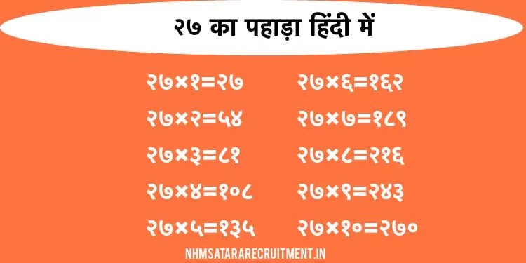 २७ का पहाड़ा हिंदी में | 27 Ka Pahada In Hindi | Multiplication Table of 27 | पहाड़ा एक गणितीय सूची है जिसे प्रायः छोटी कक्षाओं के बच्चों को अच्छी तरह से याद करा दिया जाता है। जैसे की आप सब जानते हैं कि गणित की केलकयुलेशन में पहाड़ों का कितना महत्व है। गुना एवं भाग की अंकगणित क्रियाओं का करने के बाद इसका निर्माण व उपयोग किया जाता है। वैसे यदि किसी को भी १ से ९ तक भी पहाडे याद हो तो पर्याप्त है लेकिन गणितीय तथ्थो को तेज़ी से हल करने के लिए आप सभी ज़्यादा से ज़्यादा पहाडे याद करे।