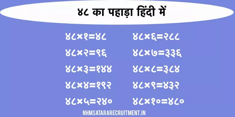 ४८ का पहाड़ा हिंदी में | 48 Ka Pahada In Hindi | Multiplication Table of 48 | पहाड़ा एक गणितीय सूची है जिसे प्रायः छोटी कक्षाओं के बच्चों को अच्छी तरह से याद करा दिया जाता है। जैसे की आप सब जानते हैं कि गणित की केलकयुलेशन में पहाड़ों का कितना महत्व है। गुना एवं भाग की अंकगणित क्रियाओं का करने के बाद इसका निर्माण व उपयोग किया जाता है। वैसे यदि किसी को भी १ से ९ तक भी पहाडे याद हो तो पर्याप्त है लेकिन गणितीय तथ्थो को तेज़ी से हल करने के लिए आप सभी ज़्यादा से ज़्यादा पहाडे याद करे।