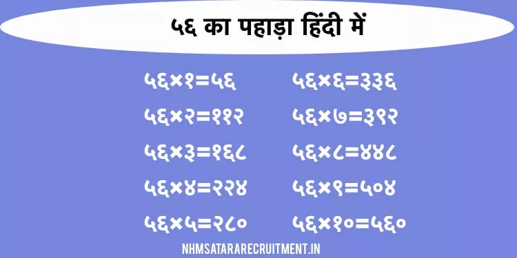 ५६ का पहाड़ा हिंदी में | 56 Ka Pahada In Hindi | Multiplication Table of 56 | पहाड़ा एक गणितीय सूची है जिसे प्रायः छोटी कक्षाओं के बच्चों को अच्छी तरह से याद करा दिया जाता है। जैसे की आप सब जानते हैं कि गणित की केलकयुलेशन में पहाड़ों का कितना महत्व है। गुना एवं भाग की अंकगणित क्रियाओं का करने के बाद इसका निर्माण व उपयोग किया जाता है। वैसे यदि किसी को भी १ से ९ तक भी पहाडे याद हो तो पर्याप्त है लेकिन गणितीय तथ्थो को तेज़ी से हल करने के लिए आप सभी ज़्यादा से ज़्यादा पहाडे याद करे।