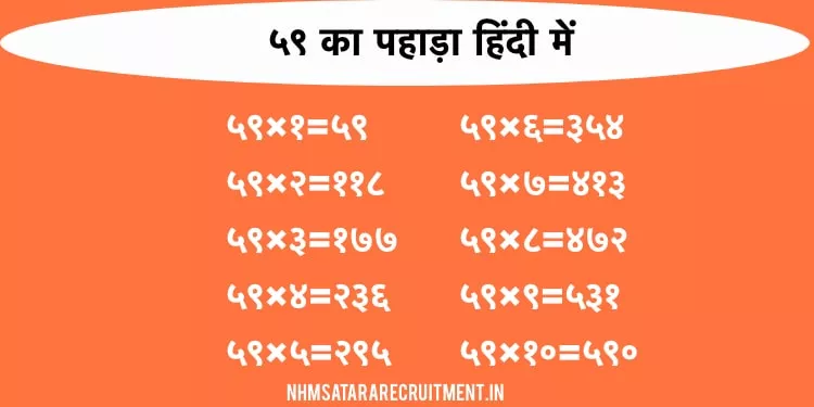 ५९ का पहाड़ा हिंदी में | 59 Ka Pahada In Hindi | Multiplication Table of 59 | पहाड़ा एक गणितीय सूची है जिसे प्रायः छोटी कक्षाओं के बच्चों को अच्छी तरह से याद करा दिया जाता है। जैसे की आप सब जानते हैं कि गणित की केलकयुलेशन में पहाड़ों का कितना महत्व है। गुना एवं भाग की अंकगणित क्रियाओं का करने के बाद इसका निर्माण व उपयोग किया जाता है। वैसे यदि किसी को भी १ से ९ तक भी पहाडे याद हो तो पर्याप्त है लेकिन गणितीय तथ्थो को तेज़ी से हल करने के लिए आप सभी ज़्यादा से ज़्यादा पहाडे याद करे।