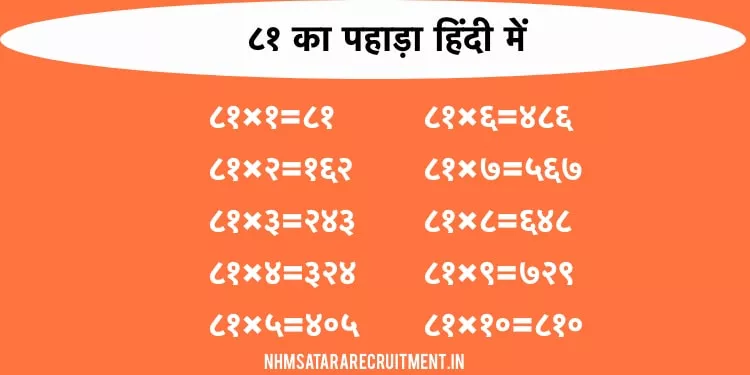 ८१ का पहाड़ा हिंदी में | 81 Ka Pahada In Hindi | Multiplication Table of 81 | पहाड़ा एक गणितीय सूची है जिसे प्रायःछोटी कक्षाओं के बच्चों को अच्छी तरह से याद करा दिया जाता है। जैसे की आप सब जानते हैं कि गणित की केलकयुलेशन में पहाड़ों का कितना महत्व है। गुना एवं भाग की अंकगणित क्रियाओं का करने के बाद इसका निर्माण व उपयोग किया जाता है। वैसे यदि किसी को भी १ से ९ तक भी पहाडे याद हो तो पर्याप्त है लेकिन गणितीय तथ्थो को तेज़ी से हल करने के लिए आप सभी ज़्यादा से ज़्यादा पहाडे याद करे।