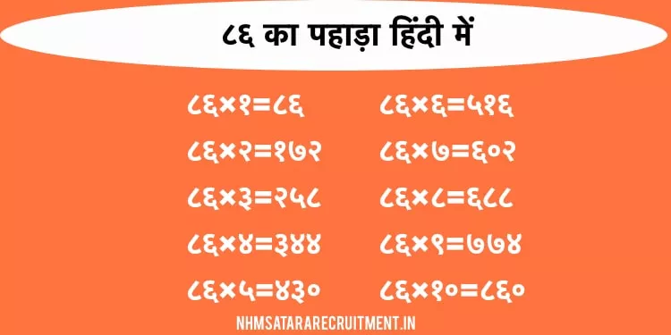 ८६ का पहाड़ा हिंदी में | 86 Ka Pahada In Hindi | Multiplication Table of 86 | पहाड़ा एक गणितीय सूची है जिसे प्रायःछोटी कक्षाओं के बच्चों को अच्छी तरह से याद करा दिया जाता है। जैसे की आप सब जानते हैं कि गणित की केलकयुलेशन में पहाड़ों का कितना महत्व है। गुना एवं भाग की अंकगणित क्रियाओं का करने के बाद इसका निर्माण व उपयोग किया जाता है। वैसे यदि किसी को भी १ से ९ तक भी पहाडे याद हो तो पर्याप्त है लेकिन गणितीय तथ्थो को तेज़ी से हल करने के लिए आप सभी ज़्यादा से ज़्यादा पहाडे याद करे।