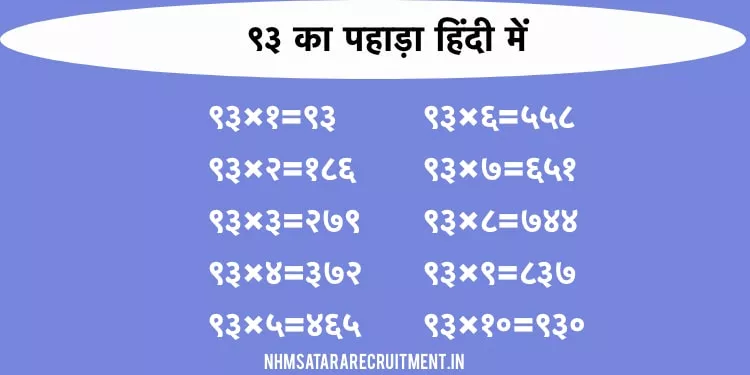 ९३ का पहाड़ा हिंदी में | 93 Ka Pahada In Hindi | Multiplication Table of 93 | पहाड़ा एक गणितीय सूची है जिसे प्रायःछोटी कक्षाओं के बच्चों को अच्छी तरह से याद करा दिया जाता है। जैसे की आप सब जानते हैं कि गणित की केलकयुलेशन में पहाड़ों का कितना महत्व है। गुना एवं भाग की अंकगणित क्रियाओं का करने के बाद इसका निर्माण व उपयोग किया जाता है। वैसे यदि किसी को भी १ से ९ तक भी पहाडे याद हो तो पर्याप्त है लेकिन गणितीय तथ्थो को तेज़ी से हल करने के लिए आप सभी ज़्यादा से ज़्यादा पहाडे याद करे।